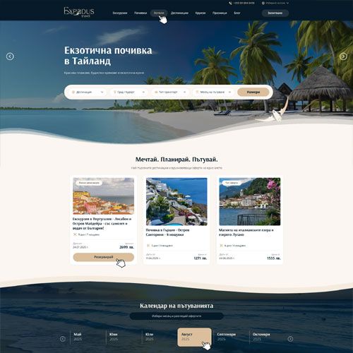 Изработка на уеб сайт за туристическа агенция, туроператор. Уеб сайтове за почивки, екскурзии, планински турове, хотелско настаняване. Имаме богат опит в разработването на решения за туристически сайт. Може да разгледате нашето портфолио.